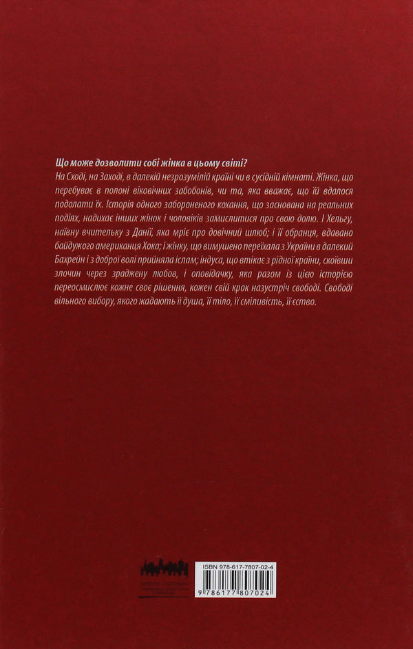 Що може дозволити собі жінка в цьому світі? На Сході, на Заході, в далекій незрозумілій країні чи в сусідній кімнаті. Жінка, що перебуває в полоні віковічних забобонів, чи та, яка вважає, що їй вдалося подолати їх. Історія одного забороненого кохання, що заснована на реальних подіях, надихає інших жінок і чоловіків замислитися про свою долю. І Хельгу, наївну вчительку з Данії, яка мріє про довічний шлюб; і її обранця, вдавано байдужого американця Хока; і жінку, що вимушено переїхала з України в далекий Бахрейн і з доброї волі прийняла іслам; індуса, що втікає з рідної країни, скоївши злочин через зраджену любов, і оповідачку, яка разом із цією історією переосмислює кожне своє рішення, кожен свій крок назустріч свободі. Свободі вільного вибору, якого жадають її душа, її тіло, її сміливість, її єство.