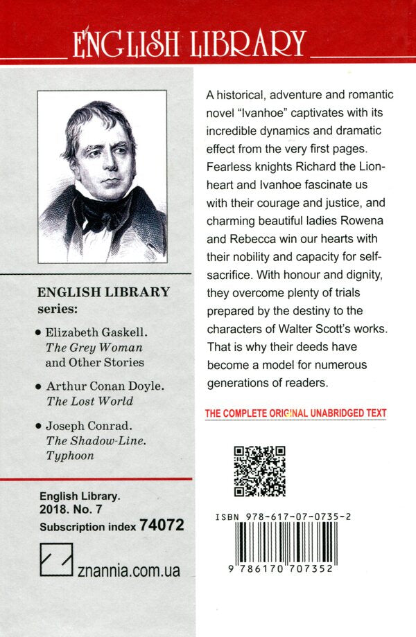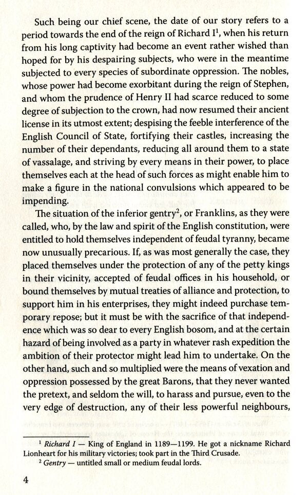 “Ivanhoe” is one of the best works of the famous English writer Walter Scott (1771—1832). The novel is set in the era following the Normans’ conquest of England, during the reign of King Richard the Lionheart. The faithful friend Ivanhoe comes to the king’s aid in his fight against the unruly aristocracy. The writer masterly intertwines personal destinies of the characters with real historical events and veraciously depicts the life of the society of that time. This absolutely captivating story lets the readers not only get acquainted with but also feel the severe Middle Ages.